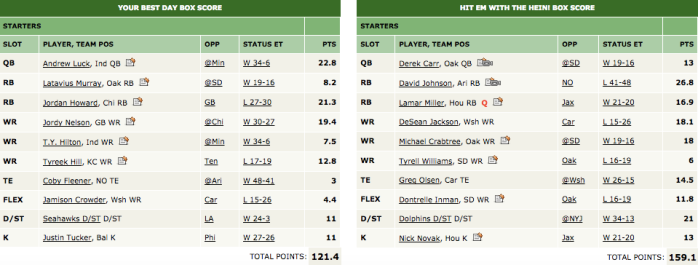 Scott “the Engineer” Salem was a big winner in last week’s quarterfinals but was hit with the Hein hard by Jason in this weekend’s semifinals. Ever reliable David Johnson put up 26.8 points for Jason’s team while Scott’s RB Latavius Murray only managed to score him 8.2 points. Now Jason, the commissioner of the Emotional Friends league, will move on and meet Will Murray in the championship game!